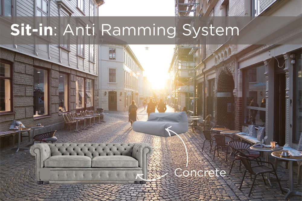 The proposed "Sit-in" system has the same primary function as the present anti-ram systems but also carries a friendly message to sit down, initiate a dialogue - and work things out!