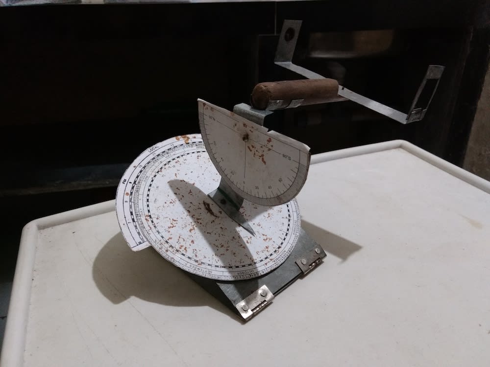 The RA dial is fixed on a board which has a semicircular scale marking the 'local time' from 6 p.m. to 6 a.m. Mounted at the center of the R.A. dial is an upright bracket which holds the Declination dial and the star sight. The Declination, the dial is a simple semicircular scale marked in degrees. When the Declination dial is set at 0° the star sight points exactly to the celestial equator.