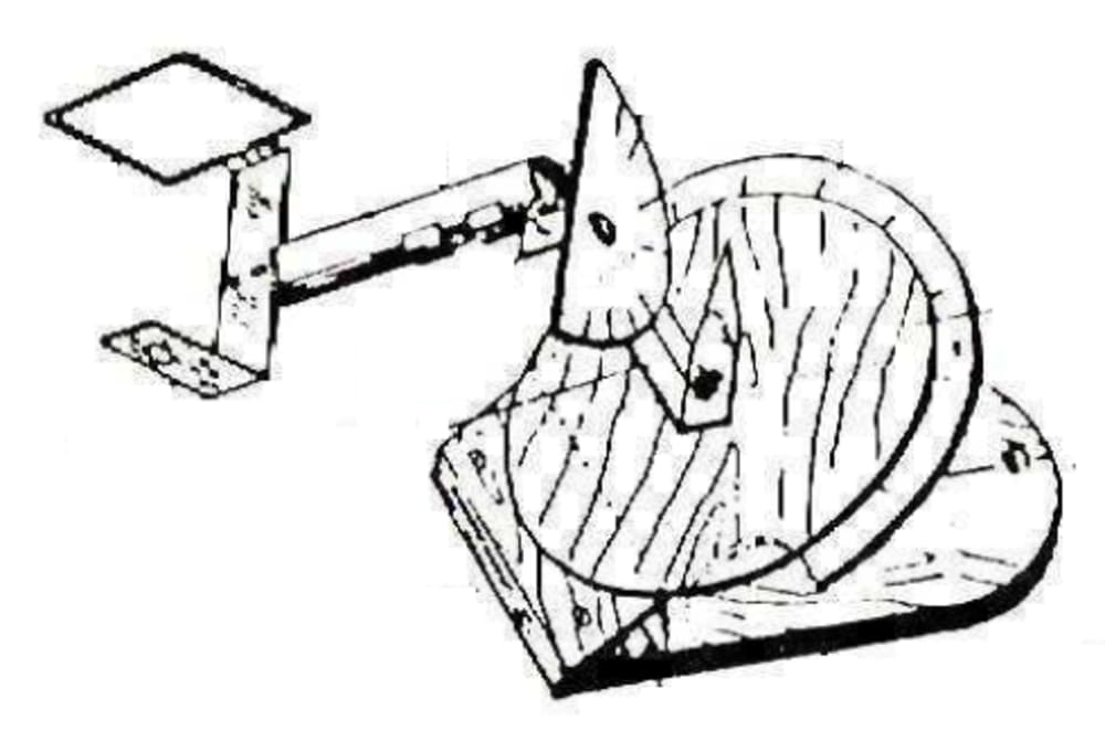 The RA dial is fixed to a base board held at an angle with the horizontal equal to 90°minus the latitude of place of use. On the base board is marked a line which should be aligned with the north-south direction before using the instrument. The star sight is fitted at the end of a long tube or wooden dowel to clear the base of the instrument. (This is necessary for viewing the star near the zenith.)