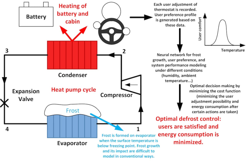 However, heat pump systems are not perfect. Defrost control is one of the most challenging problems with heat pump systems. Frost formed on the evaporator when the surface temperature is below the freezing point has significant impact on the heat transfer efficiency and thus the system efficiency. Therefore, defrosting is necessary and heat pump heating will be interrupted during defrosting process. When the defrosting process is finished, system returns to heating mode. However, defrosting process may result in reduced user comfort and, possibly, "battery comfort". Good defrost control decision making needs to consider both user comfort and energy efficiency.