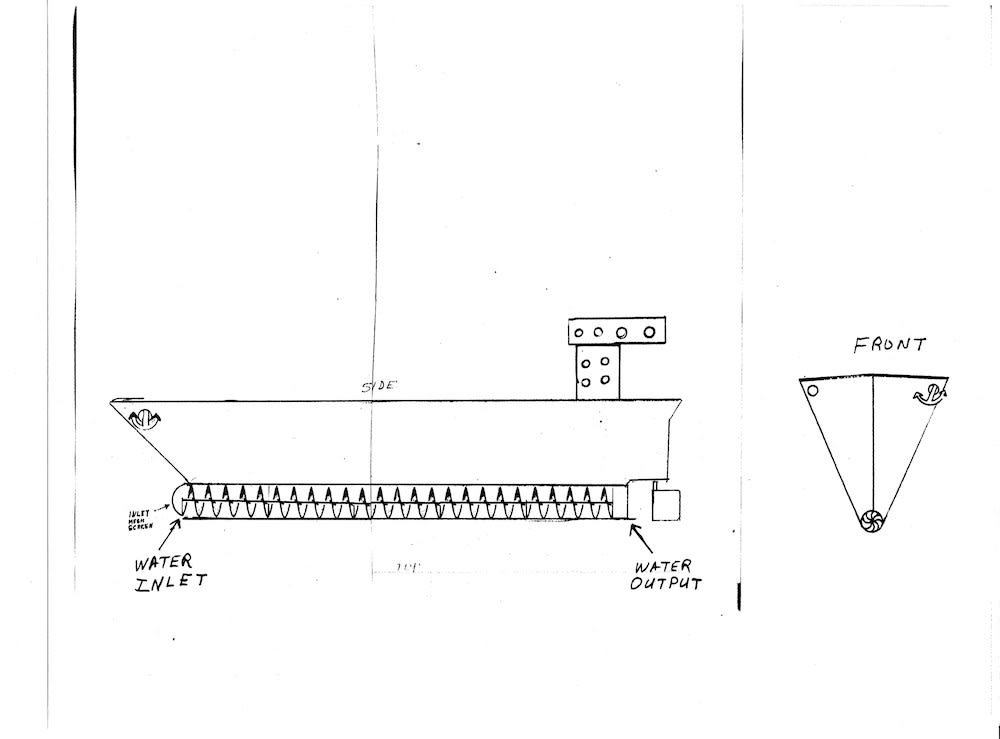 The best way to describe this invention is an Archimedes screw that runs the length of a ship’s hull. It contrasts a conventional ship by replacing the single screw or propeller with the full length Archimedes screw. Upon startup the Archimedes screw will require extra torque but once moving the inertia should reduce the load on the device driving it. One drawback is the amount of space taken up in the ship’s hold, but that should be overridden by the secondary benefit of the device also acting as a ballast helping to stabilize the vessel. Different tweaks to this device could be the number of twists per meter, a larger inlet and smaller outlet giving a “jet” effect.