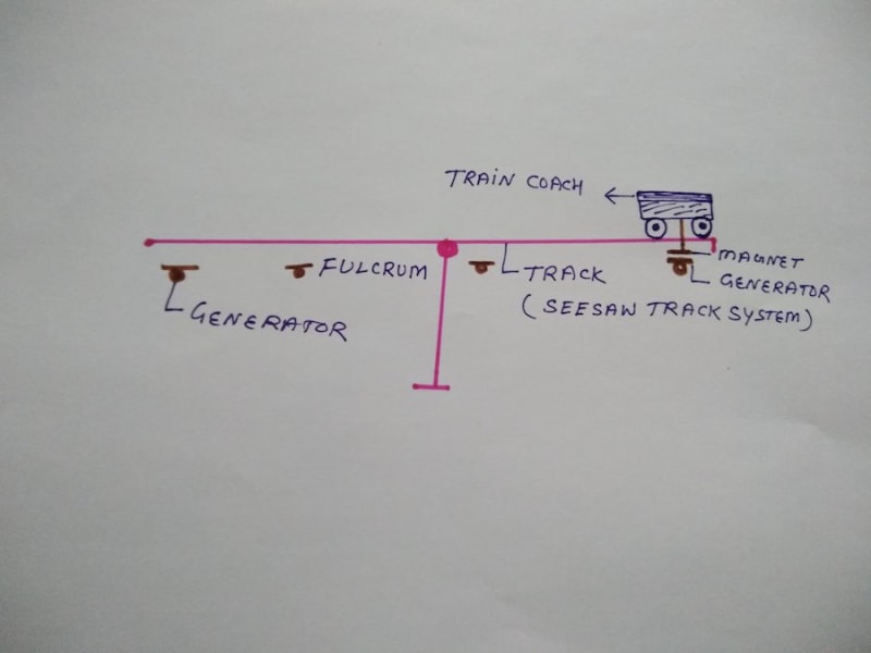 (1)There will be a need of very very less energy to move the train because we all know that to move a balanced position thing there is only need of less energy so the motors attached with small and main seesaw sytem with the help of 'L' form crank will work on less energy and after starting the train coach there will be no need of this initial energy as train coach will generate energy itself with the help of wheel attached generators and magnetic linear generators to supply this electricity to the grid ,from where motors can get electricity.The electricity generated by this train coach will be sufficient to run the whole system.