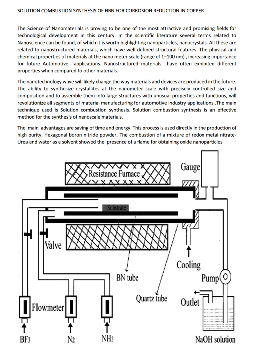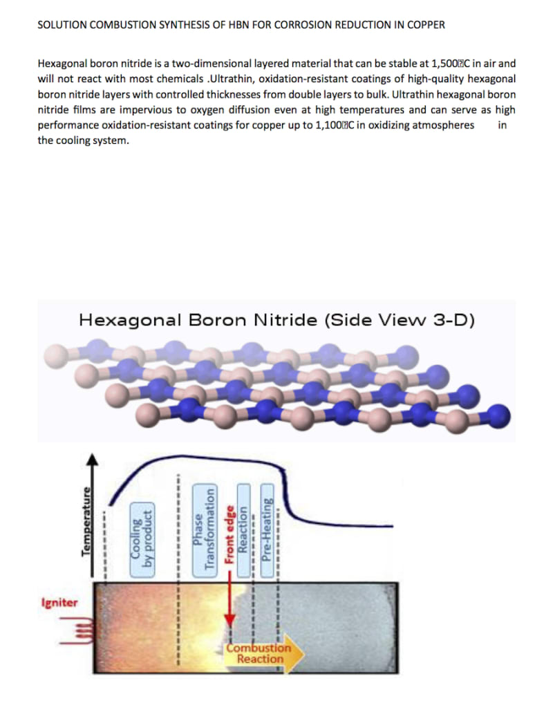 The cooling system of automobiles always have corrosion as the biggest threat to its reliability. To overcome this fatal phenomenon we have done synthesis of boron nitride in nanoscale. The synthesis of Hexagonal boron nitride is carried out with urea and boric acid. The material obtained is charecterized by SEM and TEM, the process used for this is solution combustion synthesis. The HBN is then made as a thin film coating on the copper (which is used in the pipes of cooling system of the vehicle). This reduces the oxidation between the water and the copper substrate. It helps in increasing the engine efficiency by increasing the function of the cooling system.