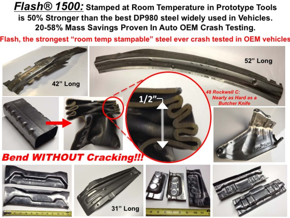 Initially developed as US Army validated record setting Armor, Flash® Technology has migrated from the Defense Industry to the civilian automobile. Flash® Bainite has been tested by three Auto OEMs to make over a dozen “room temperature stamped” components 20 to 58% lighter. Lower cost Flash parts, at strengths of 1500-1800 megapascals, provided record setting energy absorption during OEM impact testing. Regrettably, after decades of research, the strongest room temperature stamped components keeping today's automobiles safe are typically only 980 megapascals, and rarely 1180mpa.