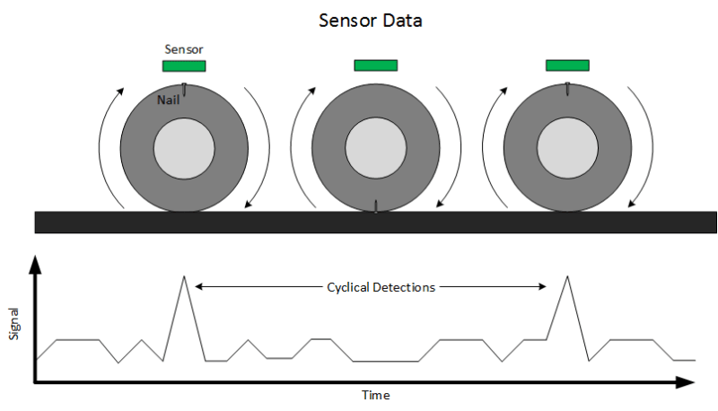 Early detection of nails and screws can be accomplished through the use of sensors. An appropriate “metal detector” (many varieties will do) is installed in a vehicle, mounted above each of its tires. Then, the signal from the sensor is analyzed to detect any cyclical patterns. The detection is limited in its range, so that it does not pick up spurious signals from other environmental factors, such as the valve stem, wheel-balancing weights, and road debris. Signal processing then accounts for background noise, vehicle suspension, and road conditions to alert the operator the moment foreign debris is acquired. The operator is notified, given them precious time to schedule maintenance and avoid disaster.