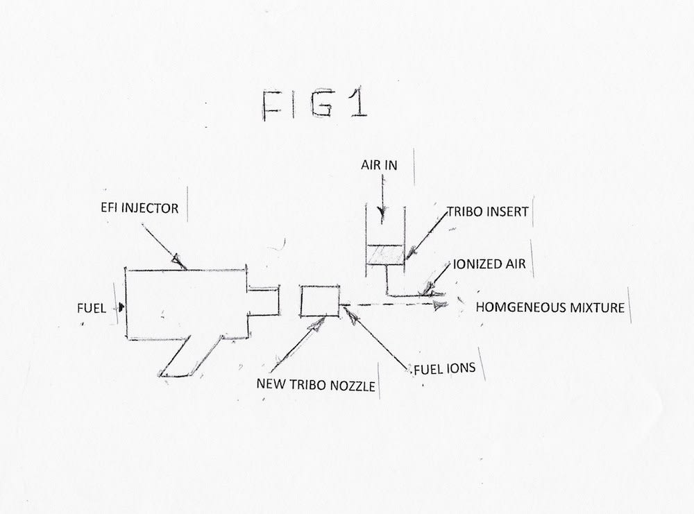The triboelectric treatment will consist of a new nozzle added to the existing EFI body and a triboelectric insert in the air supply consisting of easily fabricated inexpensive known materials. (Fig. 1) The major advantages of this combustion mode are very significant fuel savings, emission reduction and retrofitting in a NOW time frame as near ideal combustion is achieved.