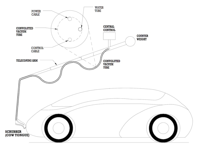 ECW functions like an elephant trunk, but, instead of a nostril, a cows tongue type device, or, mini car wash.