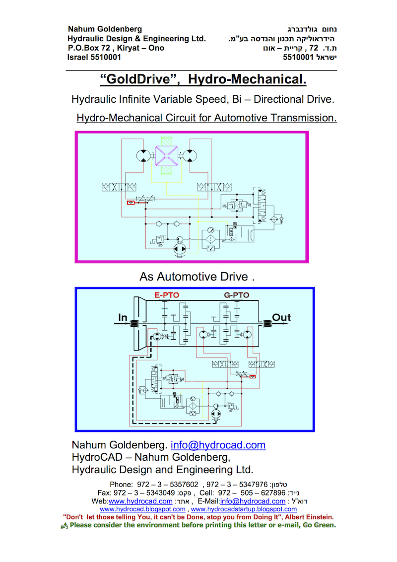 “GoldDrive” is an infinite variable, bi-directional drive consisting of hydraulic fixed displacement pumps and motors. As a matter of fact “GoldDrive” is the hydraulic equivalent of the mechanical differential. The idea behind the development of “GoldDrive” is to overcome the limitation of starting torque. According to the traditional equation, torque is equal to power over speed and as a result, we need an infinite amount of torque to start a load at zero output speed. The solution is Slippage, slippage of electrical, mechanical, hydraulic and pneumatic transmissions. “GoldDrive” enables us to achieve full torque at zero output speed.