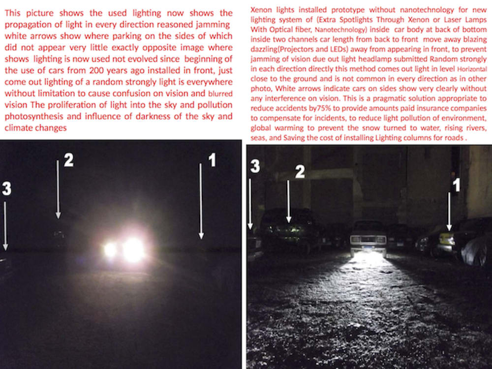 The present invention relates to strong lighting by using optical fiber and nanotechnology for vehicles. Optical fibers are used with luminous element inserted such as florescent, white or red phosphor or zinc sulphide treated with nanotechnology. They are used with laser lamps, lead, or xenon to enhance night vision and to redirect strong lighten to a horizontal level near to the ground to avoid vision problems affecting drivers during driving at night. According to the present invention, two channels are arranged along the bottom part of a vehicle. In another aspect, a double bottom part is established.
