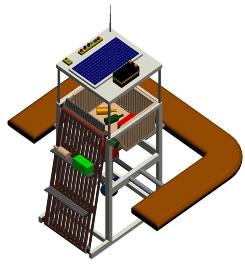 The device is place across a drain so that only water flows through the lower basement. Floating waste like bottles, plastic cans, covers…..etc. is lifted by lifters which are connected to the chain. The chain revolves with the sprocket wheel which is driven by the motor. The energy provided to the motor is electrical energy. When motor runs the chain starts to circulate making the lifter to lift up. The wastage material are lifted by lifter teeth and stored in storage or collecting bin. Once the collecting bin is full, the waste materials are removed from the bin.
