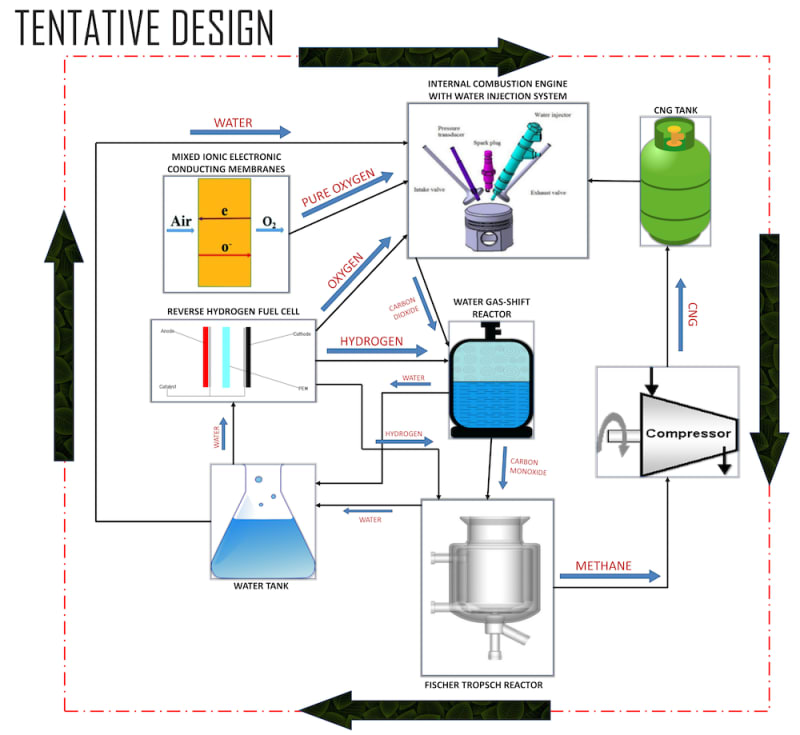 About 4.5 million premature deaths are caused by outdoor air pollution. 50% to 90% of the air pollution is caused just by the vehicular toxic emission. This research is about a design of series of processes which might create a fuel cycle in an internal combustion (IC) engine setup. This proposed fuel cycle consists of separating oxygen from air using Mixed Ionic Electronic Conducting Membranes. Then oxy-fuel combustion takes place which will be resulting into energy to run the vehicle and a pure carbon-dioxide stream.  Water-injector is used to keep the IC engine cool during very high temperature combustion process. Carbon-dioxide is then reacted with hydrogen to produce carbon monoxide under Water Gas-Shift Reaction. Carbon Monoxide then reacts with hydrogen obtained from water through reverse fuel cell under Fischer-Tropsch process to produce natural gas. Natural gas is then compressed and stored in the tank. The compressed natural gas is now used as the fuel and its combustion also produces pure carbon-dioxide stream. Thus carbon-dioxide can go through the same series of processes to produce compressed natural gas and hence a fuel cycle is created in the IC engine setup. This might result into very less consumption of the fuel or only water might be required to run the vehicles. Electric cars don't contribute in air pollution directly but indirectly they do and it will take decades to replace all the cars to electric cars. Till then, the pollution will be at extremity and this research might help to avoid it.