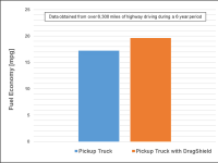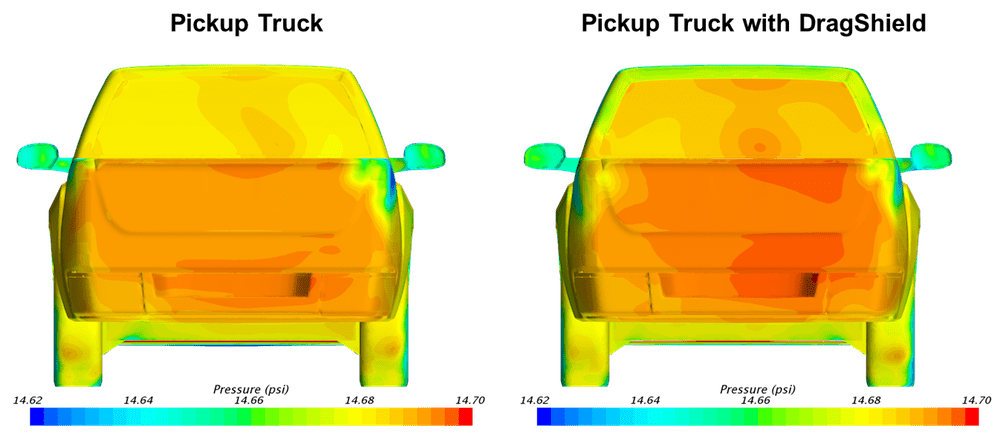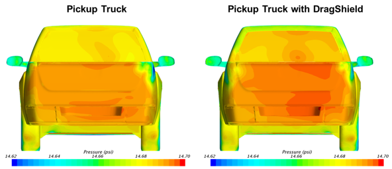 The DragShield design has been validated in Computational Fluid Dynamics (CFD) simulation software as well as in real-life road testing with multiple prototypes. The CFD results show a significant drag reduction with the DragShield installed and data from the road testing reveals that the DragShield increases gas mileage by 14%, yielding an extra 2-3 miles per gallon. The road testing was performed with the DragShield installed on a 2011 GMC Sierra 1500. Mileage gallon data was obtained during multiple long distance road trips, totaling 6,300 highway miles over a 6 year period.