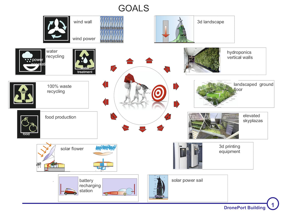 The building proposed incorporates droneports at different leves for the bigger personal drones and smaller unmanned delivery drones. All services for storing cargo and drones as well as recharge their batteries from renewable sources are included in the upper floors of the building.