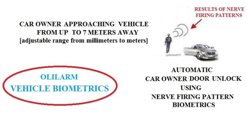 Olilarm locks and unlocks on owner's bioelectric field. No one else has this technology. Olilarm uses the body`s own results of nerve firing patterns as the biometric key to locking/unlocking your car. This biometric key cannot be duplicated nor intercepted because it is not a radio signal but a living bioelectric field signal. Olilarm needs no fingerprints, voice recognition, facial recognition, iris, palm print, etc.