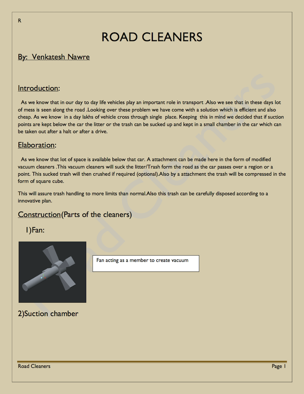 As we all know an important part of every person's life is transport and for them we use our vehicles which includes cars and mopeds .....Every day while driving our vehicles we come across the litter or waste or scraps that are distributed along the roads .....We may wonder many times can we clear that this litter while riding our vehicle .....But possibly we can clear this....Let see how...Cars are used every day and while getting a look over our cars we see that there is a lot of flat surface available below the car which can fix an external attachment of small suction holes or modified vacuum cleaners which will suck the.litters of designated mass. It will be powered by the car's battery or external supply ....This idea will save the money of government on sweepers that are employed on the maintenance of roads as lakhs of vehicle pass through a same point over a day ...Moreover this idea will impact on the remote location where sweepers cant reach.....Also this liter if managed in proper manner can be used for maxing fertilizers .....This attachment cost may be very less as compared to cost of the car we are purchasing .....One time investment from people and life time benefits towards cleanliness of our city.