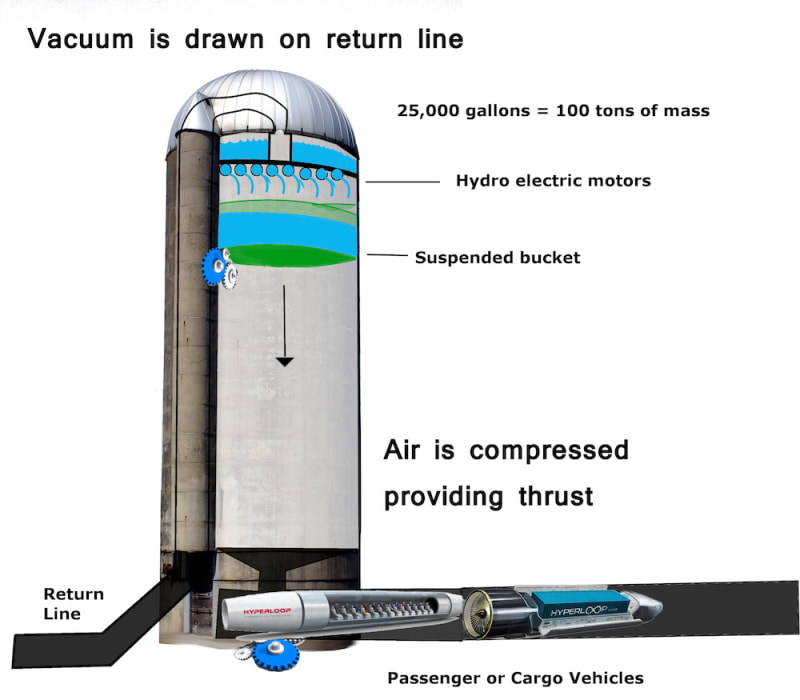 My idea to Create the Future of transportation, is to link urban centers and help eliminate traffic and pollution by employing renewable energy and one of the most powerful forces in nature, falling water, to operate a Hyperloop. The idea is to elevate water by pumping it to a high point using solar energy and then using that mass, volume, and pressure of the water as stored energy for propulsion, electrical generation, compression and suction too.