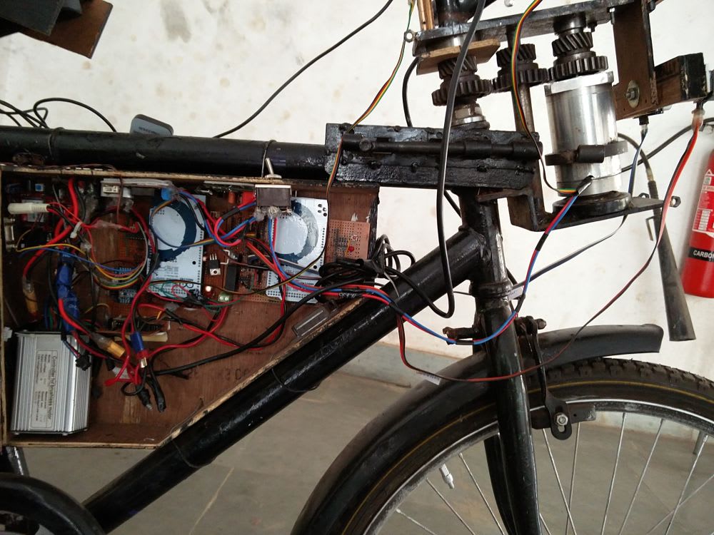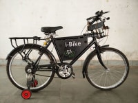 A 250 Watt, 24 Volt hub motor is used to power the bicycle which is fitted on rear wheel. A DC servo motor with a precision of 0.2 degrees is used to steer with the help of gears. Wuxing brake levers are used in place of normal ones to facilitate regenerative braking. A pair of retractable balancing wheels is used to stabilize the bicycle. Two Inertial Measurement Units, a GPS and Odometry data calculated using encoders on drive motor are used to localize the bicycle. To control and navigate i-bike, IMU, GPS and Sonars are used synergistically to create a closed loop control system. i-bike uses Computer Vision to plan the upcoming pathway. An i-Bike Android application is created which acts as controller & information provider. It has certain other features as well such as tracking through GPS; wireless GSM based control and vehicle security applications which make it all the more intelligent. In essence, the modifications brought in, serve the purpose to a great extent and are quite robust and feasible both in terms of its cost and durability.