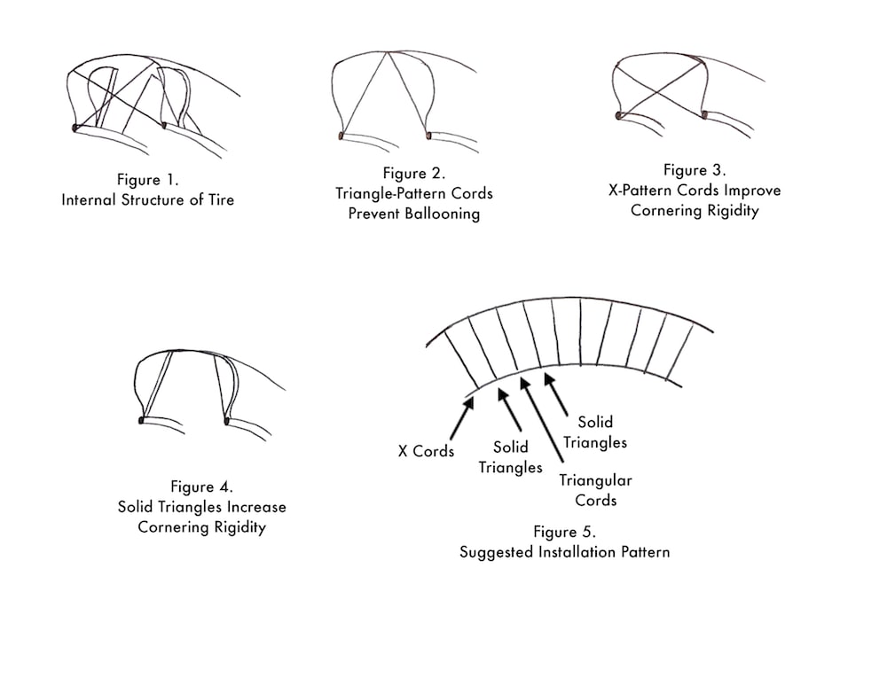 The X-pattern internal cords can be standard tire cords to allow flexibility while providing some added rigidity, or they can be optimized for performance by making them out of a semirigid material such as cord-reinforced rubber, resin, or composite. Using stiff composites would transfer cornering force from the outside shoulder to the inside bead of the tire, causing increased cornering rigidity and performance.