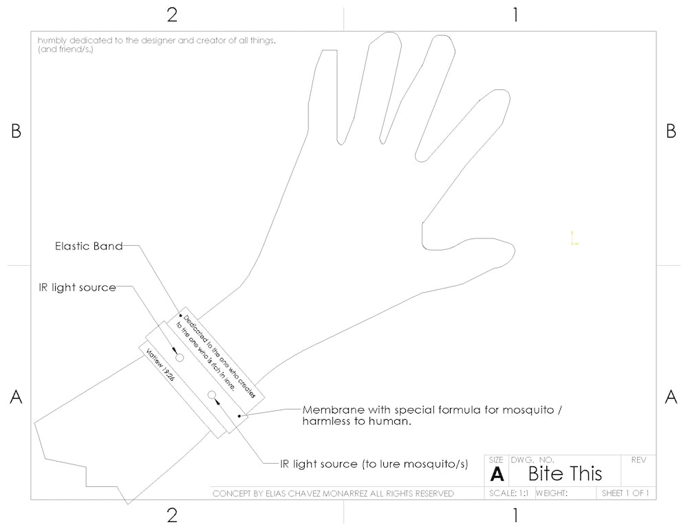 As we all know, mosquitoes are carriers of all sort of undesirable things. Don’t need to remind you of the latent possible comeback of Sika virus to our lands as temperatures get warmer and the vector population increases. Hence we should fight back with all we've got and if we don’t have the tools we must create them for our safety and own good. This concept and design is an elastic band covered with a membrane impregnated with a special formula and some infrared light sources to attract mosquitoes and once near the warm and tasty membrane would provide the insect/s its / their final bite. (It's worth the try, simple to make, safe for the masses and everyone should have one.)