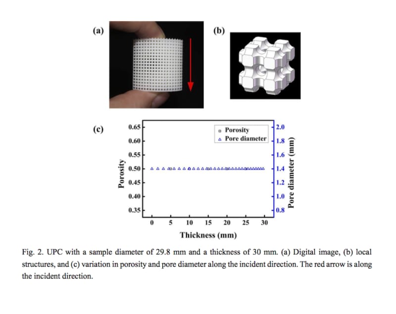 Fig. 1(b) shows the local structures of the CGPCs. Fig. 1(c) shows the variation in porosity and pore diameter along the incident direction of a CGPC. UPCs are designed for reference. They are porous cylinders with uniform, periodic structures and produced using 3D printing [Fig. 2].