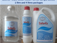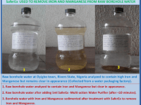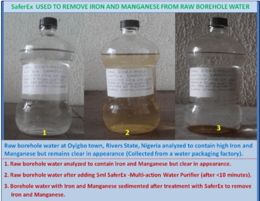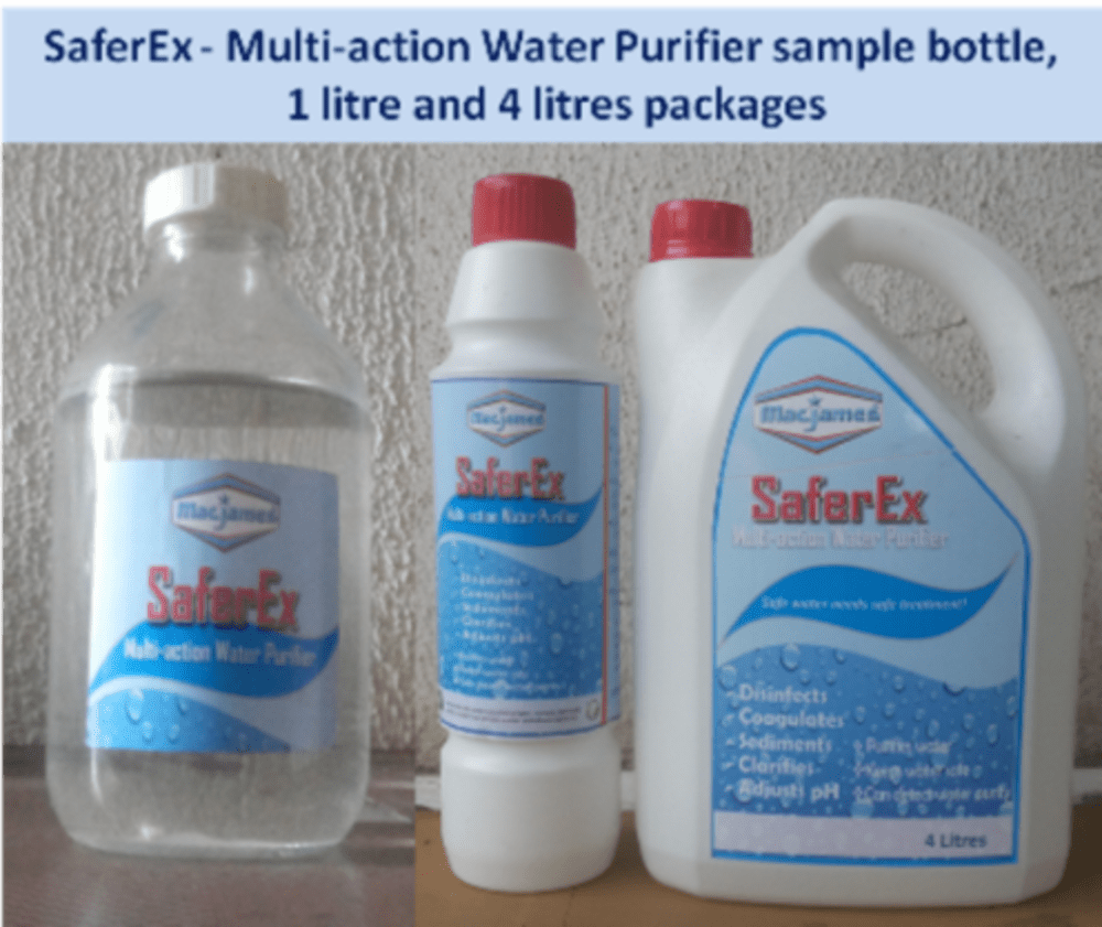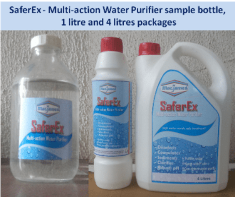 SaferEx - Multi-action Water Purifier is an innovative multi-action and safe colourless liquid that purifies unsafe borehole/well and containerized water, makes it safe for drinking, hygiene and sanitation uses to prevent the prevalent waterborne diseases and deaths. It has been effectively and economically confirmed to purify unsafe fresh and salt borehole/well water by disinfecting/killing pathogens (bacteria, viruses, protozoa, etc) in the water; sedimenting suspended particles, metals that cause water hardness (Calcium and Magnesium) and staining (Iron and Manganese), and salts, removing colour, odour, and taste, among others, "in a single application and a unit process", like never before; by simply mixing it with the unsafe water in a container or tank and decanting or filtering after 1-6 hours (depending on contamination level) at less time and cost-efficiency compared with combinations of other multiple-process treatments (using disinfectants, alum, filters, etc) in use to achieve same but without getting desired results and difficult to handle by rural dwellers and others. SaferEx is an invented chemistry and an innovation that is easy to use with only simple instructions by using existing containers/tanks or treatment facilities. Rural/urban households, farms, etc and others having existing buckets, containers/tanks, and water treatment facilities can use it as a single multi-action water purifier to purify water that meets World Health Organization (WHO) standards and Nigeria Industrial Standards(NIS) parameters for safe water. It is formulated and manufactured from refined and regular potable water treatment chemical raw materials.