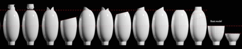The series of vessels are created from one basic form. By adding two basic forms, we get a new shape (vase / vessel). When the cut level of this form is changed, we get the following new forms. Having one basic form we can get a different product. Possible materials: ceramics. Also, the distinguishing feature of the project: manufacturability for production. You do not need to create several different plaster molds for ceramic castings - just make the same castings of the same base shape, and connect the two forms, and then we can do different cut level.
