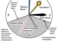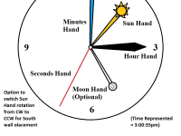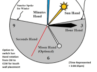 2) The clock could be placed instead on the North wall (looking from South point of view) with a switch activated to reverse sun hand travel and moon hand travel from clockwise (CW) for South wall placement to counter-clockwise (CCW) for North wall placement.