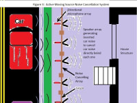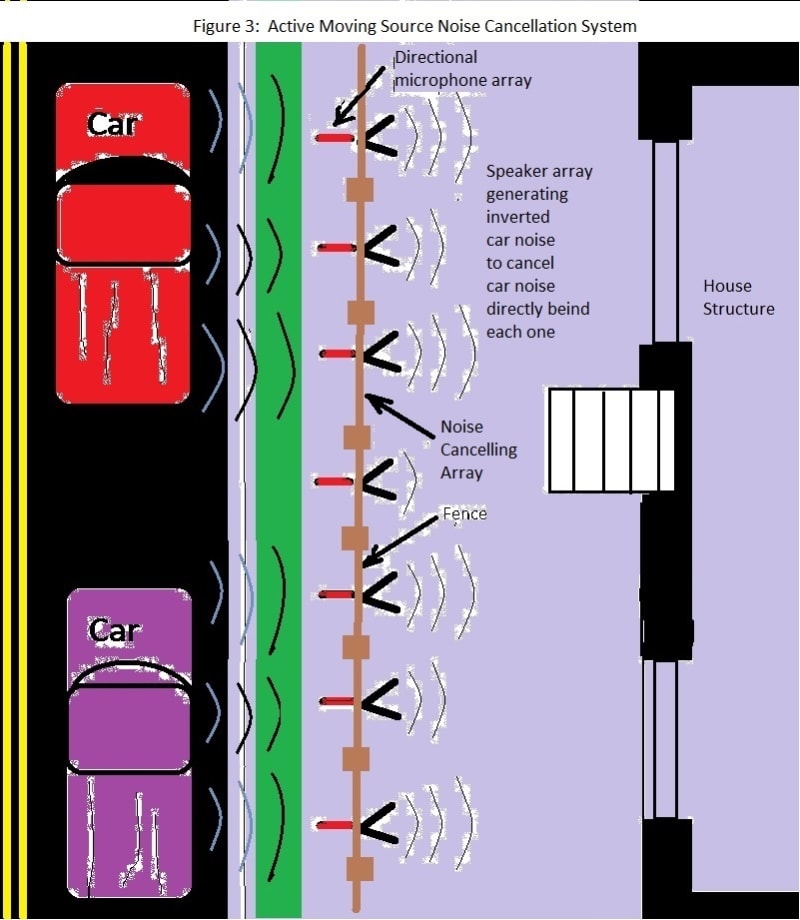 As fence microphones picks up the traffic noise, the processor inverts the signal and feeds this signal directly to the speaker behind microphone/processor. The speaker sound cancels the incoming sound by addition. For example, if the sound is a(sin(b(t))) were a and b are constants and t is time, then the speaker puts out -a(sin(b(t))) which when added suppresses the sound. This inverted signal is broadcast towards the housing structures by the speaker directly behind the microphone/processor. This system’s power could come from solar powered batteries. The solar cell could be inlaid between the post and batteries inside the post. This system “follows” the sound of the moving noise source, such as a car, so that the active noise suppression is always between the moving source and the structure. Microphones may also mount near various windows facing the noise source. The microphones near the windows send signals to the amplifier to adjust speaker volume and waveform to compensate for distortions due to reflection off the structure to minimize the noise heard inside the house.