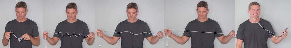 The illustrations below demonstrate the following: 1) The first shows the KwikCoil attached to earbuds and shows that the full design length is still available to the end user. 2) Shows tangled ear buds before the KwikCoil is attached. 3) Show three users with their KwikCoils attached.