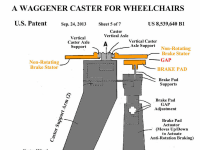 Figure 1 illustrates my Wheelramps, a new caster arrangement first described in US Patent 8,539,640 B1. Wheelramps improve safety and reduce the force needed to overcome obstacles by introducing a secondary wheel/pulley and belt arrangement, thereby forming a built-in ramp. However, if the ramp encounters an obstacle forward of the vertical caster axis, the Wheelramp may try to turn in an unwanted direction. This possibility is avoided by allowing the ramp to slightly elevate, thus activating a vertical axis anti-rotation brake, and then to release the brake when the ramp is no longer elevated. Forward motion is not otherwise impeded, so normal travel is unhindered.