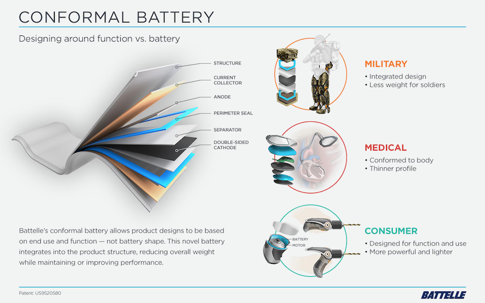 Battelle’s conformal battery is revolutionary in transforming end use products. Whether it is used in power-integrated, lighter weight military gear designed to better aid our service men and women; lower profile, body contoured pacemakers for a more comfortable heart patient experience; or advanced power tools for the weekend warrior, the conformal battery advances the design process resulting in easier to use, higher performing power-driven products.