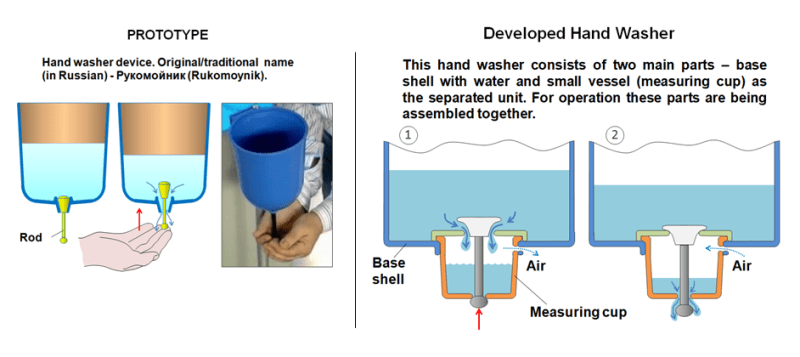 PROTOTYPE. Such a hand washer device is well-known in Russia more then 150 years. It is very demanded device in country side without centralized water supply. Its traditional name is rukomòynik, i.e. hand washer.