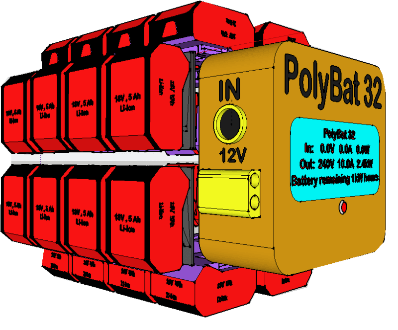 PolyBat is a device which enables multiple Portable Electric Tool batteries to be connected together onto one assembly. The purpose is to provide a power bank for applications other than powering tools. Different Amp_hour batteries can be mixed such as 5Ah with 2Ah to get 7 Ah.