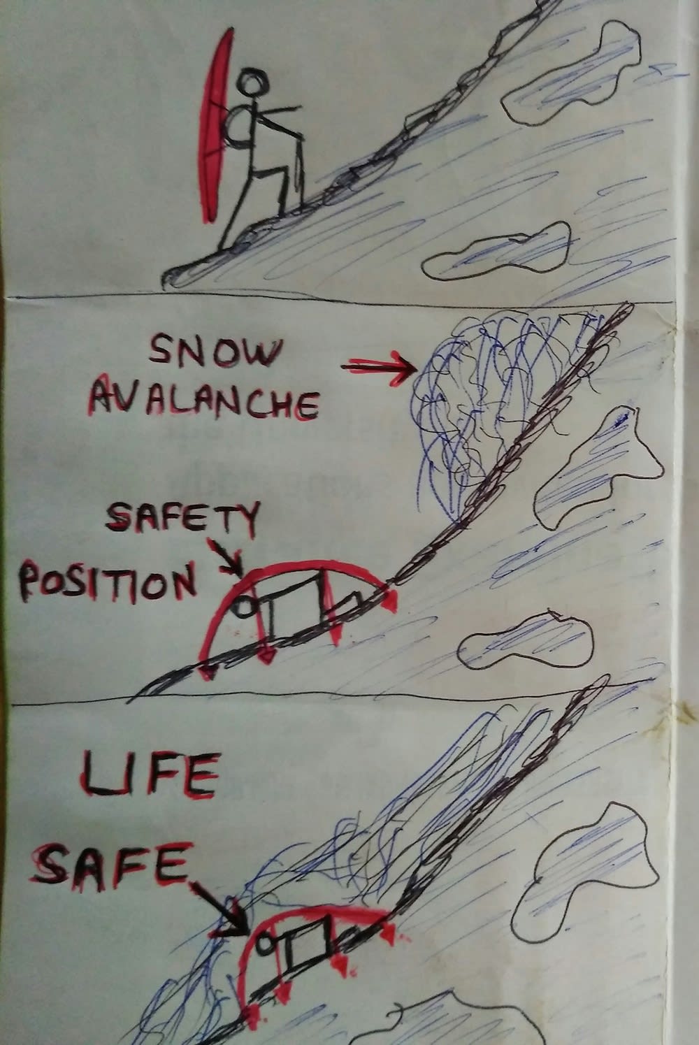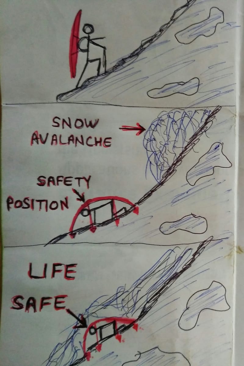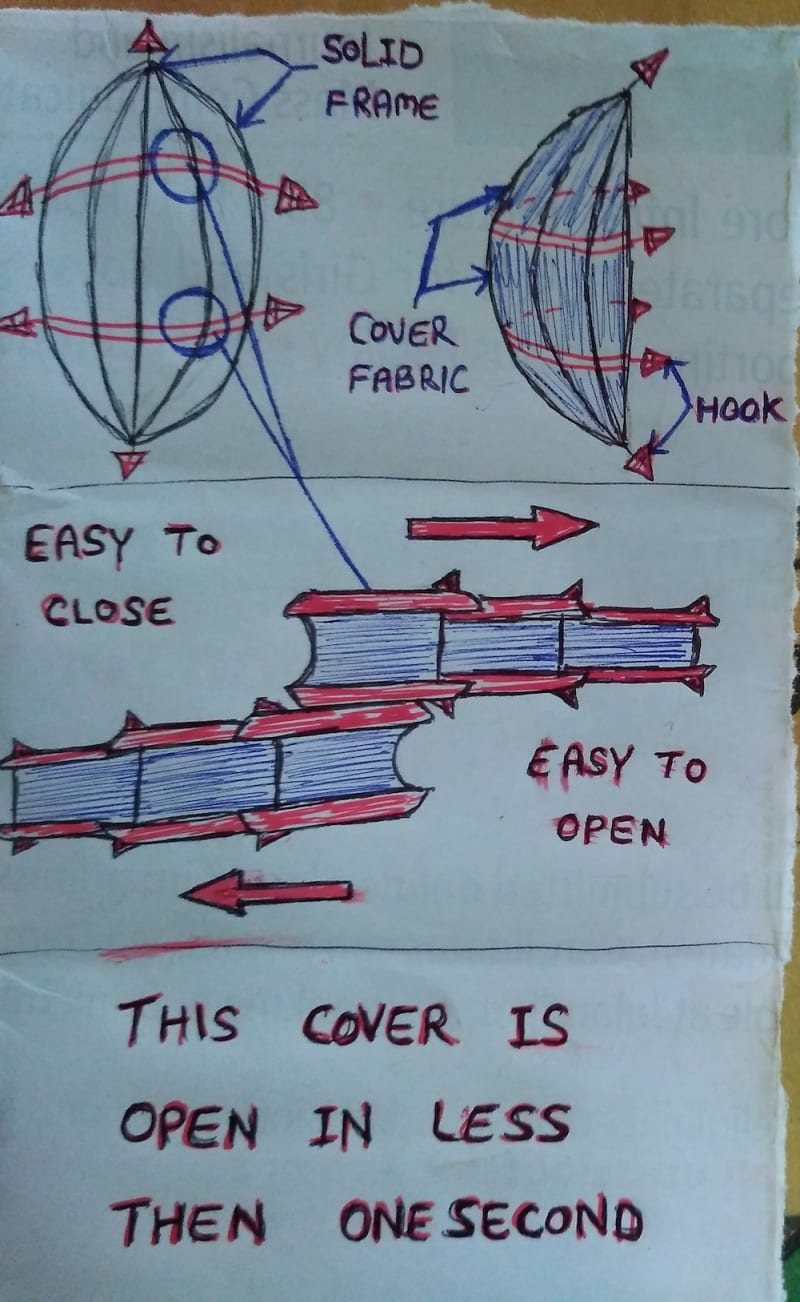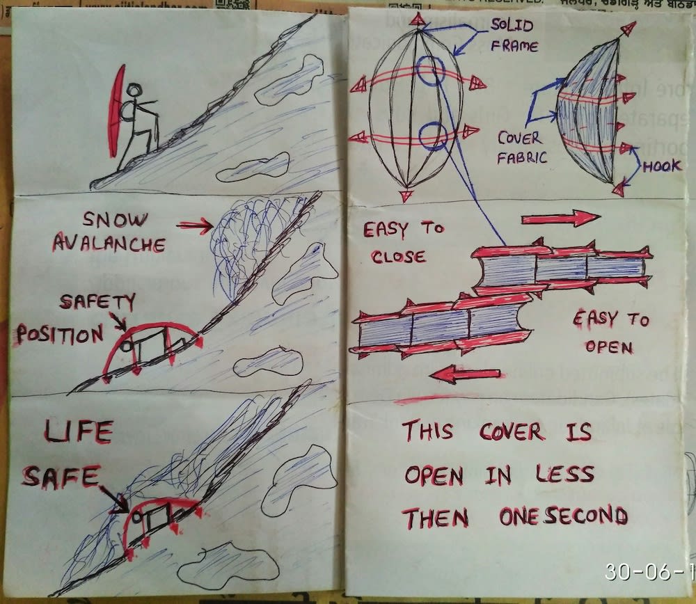 I have made safety equipment to save the lives of mountaineers, who are in danger of dying in snow avalanches, especially those Army men who are deputed in snow mountains all over the world. And this equipment is also very useful for snow surfers. I made it with strong tuff fibre, fixed long hollow pipes to support and used 2 center supports with easy to open and easy to close mechanism (e.g.umbrella rod) and also used 6 hooks to hold the ground surface to avoid slip.