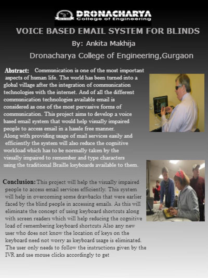 Communication is one of the most important aspects of human life. The world has been turned into a global village after the integration of communication technologies with the internet. And of all the different communication technologies available email is considered as one of the most pervasive forms of communication. Emails have become a norm of communicating with each other replacing letters completely. Even after other technologies such as social networking and others are also taking hold over the internet world; emails remains the most ubiquitous form of business communication. However all these technologies can be of no use to the people who are visually impaired as all activities that can be performed on the computer is based on visual perception. Although advancements are made in computing field to enable the visually impaired people to make these technologies they still face some minor hardships. As nearly 285 million people worldwide are estimated to be visually impaired it becomes necessary to render internet facilities for communication useful for them also. This project aims to develop a voice based email system app that would help visually impaired people to access email in a hassle free manner. Along with providing usage of mail services easily and efficiently the system will also reduce the cognitive workload which has to be normally taken by the visually impaired to remember and type characters using the traditional Braille keyboards available to them. The GUI of this system has been evaluated against the interface of the traditionally available mail system. Along with the blind, the illiterate can also benefit from this system. The most crucial aspect that is considered while developing this system is that the users of this system can easily use the app by the facility of text to speech and speech to text .