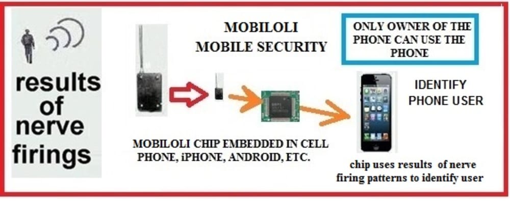 Mobiloli is a passive chip that can be embedded in a mobile phone and gives user identification accuracy using voice or sound recognition software because the frequency of the nerve firings is in the same range as audio signals.