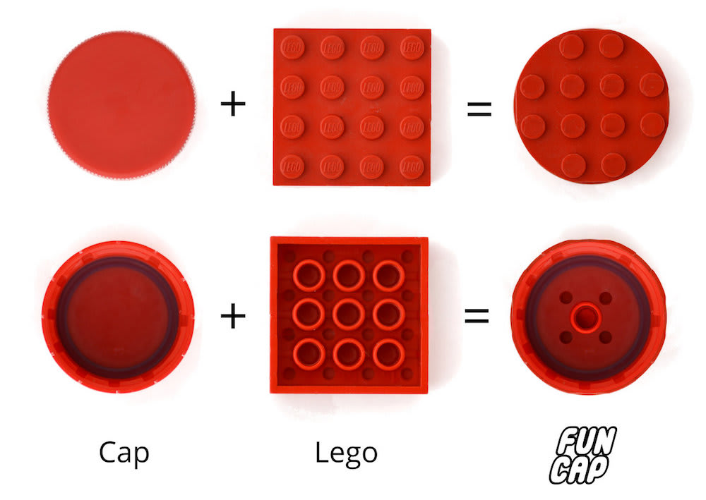 FUNCAP combines the desired properties of a plastic screw cap (such as tight seal, easy to press down on the threaded bottle neck on the filling production line, easy to open by hand) with the properties of a LEGO brick (such as high quality, fine tolerances and perfect mechanical connectivity with other LEGO bricks).