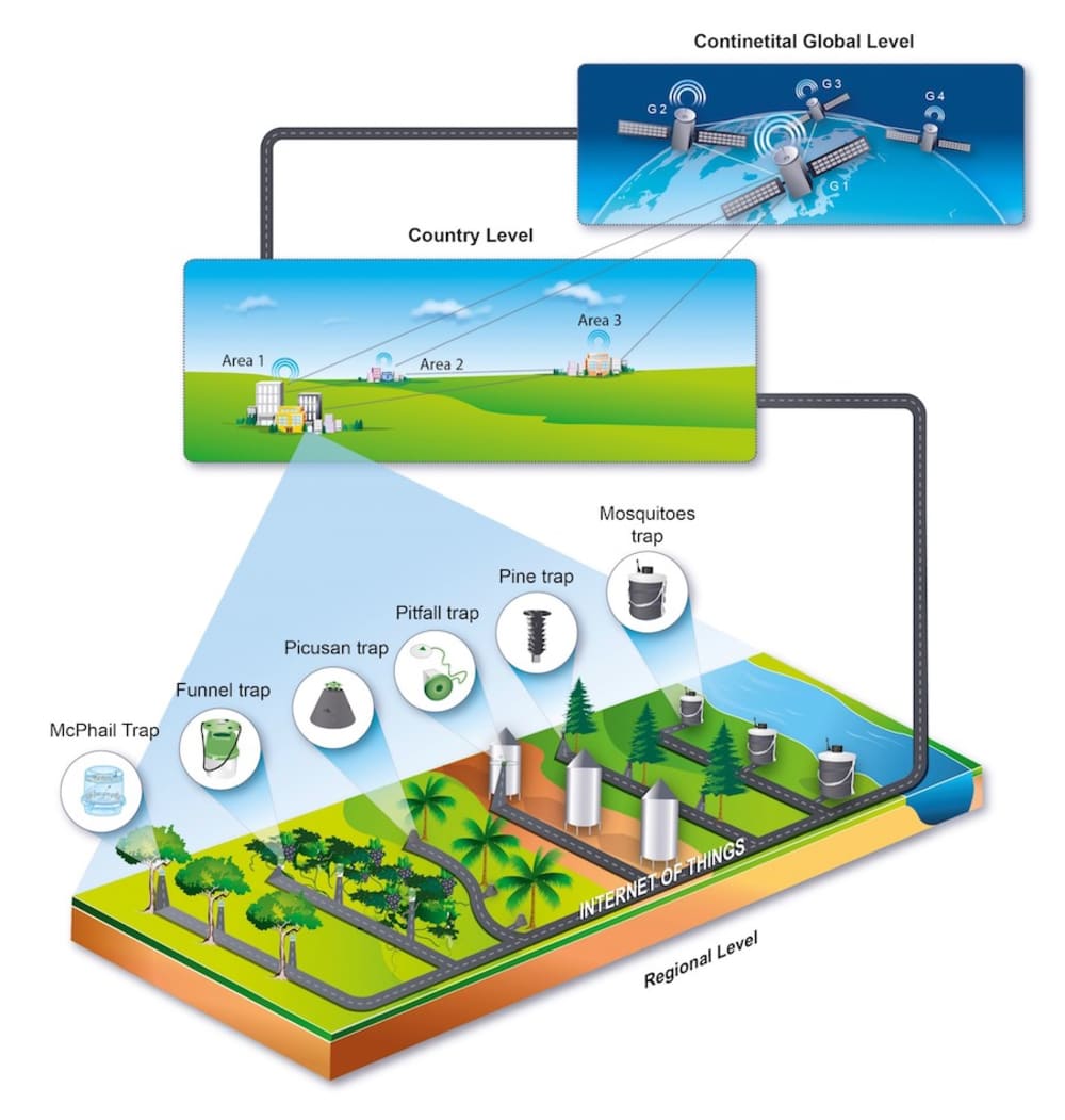 The traps can be self-organized in networks that collectively report data at local, regional, country, continental, and global scales using the emerging technology of the Internet of Things (IoT).