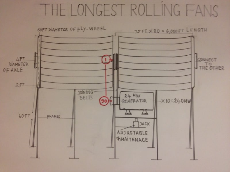 This concept 6,000 ft length x 60 ft diameter and 4 ft diameter of axle at center. 6,000 ft length divide to 80 terminals connect to the other by joining axles. The fly-wheels attach each side of axles from right to left .197 curved fan blades mount on each side of fly-wheel. They all spin at the same times. This concept hook-up to 10 Generators. Each one produces 24 MW capacity X 10 =240 MW .Estimate about 160,000 homes. Place this concept on-shores, off-shores, mountains, flat areas. Where they have strong wind. The best places are on-shores off shores because the wind flow 1 direction. More details please see at pictures. Thanks.