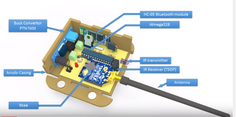In Vehicle:- There will be acrylic box with 2 Micro-controller Atmega328P-PU by Atmel, GPS by Parallax, IMU MPU6050, ZigBee, Bluetooth HC-05. Vehicle will have 12V battery and step down by buck convertor LM2576. Sensors like gas sensor MQ-135, ultrasonic sensor will be connected to it. ZigBee in vehicle will be set as ‘router’ which form mesh network. Full system draw 200mA with 5V supply. Two controller will communicate with each other through i2c protocol. One controller will read data from GPS and ZigBee. Second controller will read data from sensors and Bluetooth. Bluetooth will connect to mobile for configuration of vehicle system. Ultrasonic sensor will give reading of obstacle in the range of 4m.