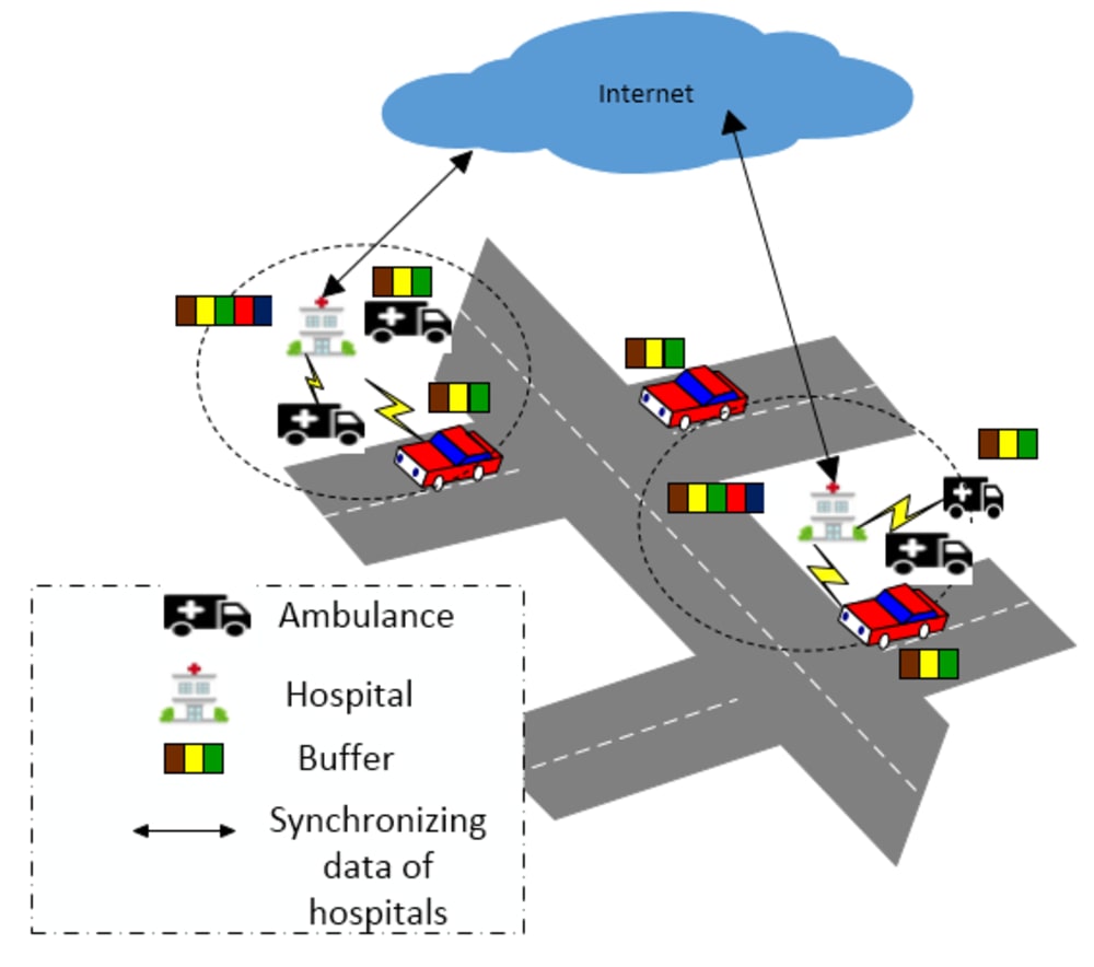 Sequence of steps are required for taking action on EM. We record the simulation time at which this message was received by the hospital node, so that two messages being received at same time can be served better. All the hospital nodes then collaborate among themselves to find one node from which the ambulance will be dispatched for the event to be served. Ambulance is sent from a hospital node which is nearest to the event location.
