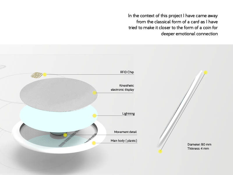 My innovative card design recreates this feeling. Before making a purchase a user starts a dialog with a card and touches the haptic screen. And the dialog starts with "love" movement. After preparing the product to a dialog a card collects data about client’s finances, location, history of purchase and generates one of 3 answers, not by words but haptic reaction with micro discharge (which repeats 3 different levels). A client gives love to the card - and the card answers.