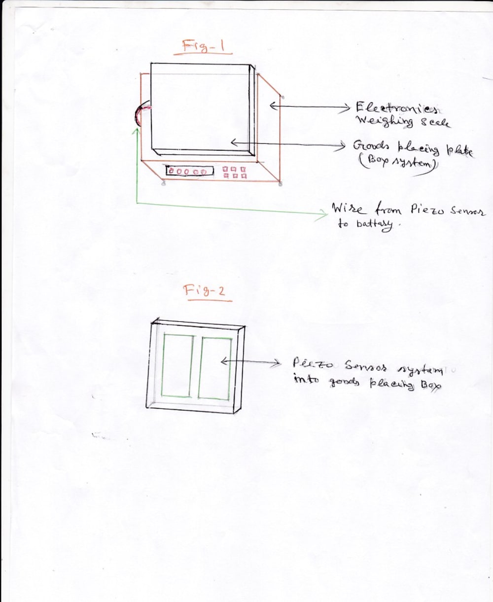 For this system, the top plate of weighing scale, where the goods will placed for weight, to be make by two part (up & down). On its down part, Piezo Sensor (full system without battery)to be kept and upper part to be lay on it. When the goods (minimum weight of 250 gm) will be placed on upper plate, then the plate will give pressure on Piezo Sensor and the sensor convert the pressure to a voltage, that will do charge the battery, which is installed in to the weighing scale structure.