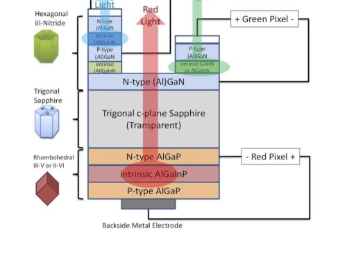 NASA Langley Research Center has developed a process methodology for making red, green and blue LED device structures on the same substrate (wafer), which is not possible today using current techniques. Such devices are manufactured individually because of different crystal structures. This innovation is enabled by the prior innovations by NASA Langley Research Center.
