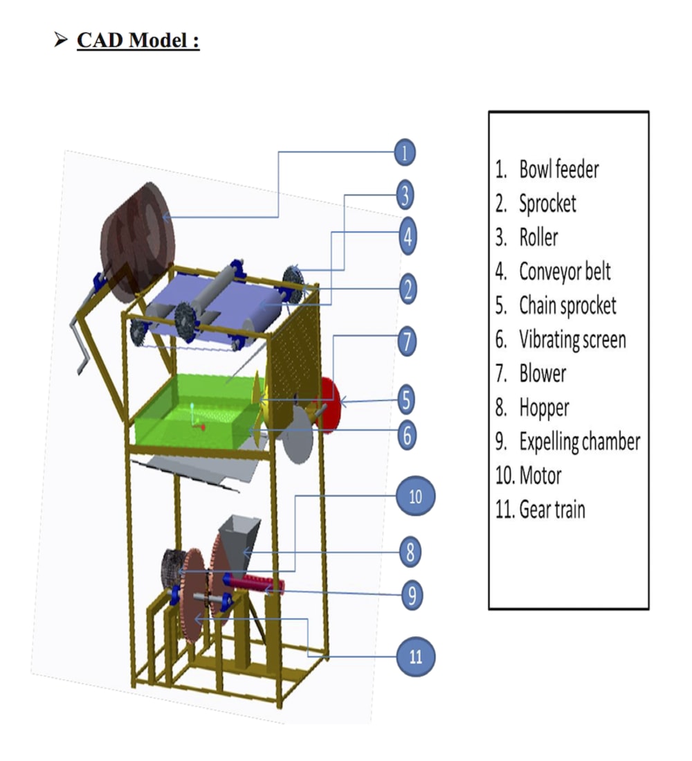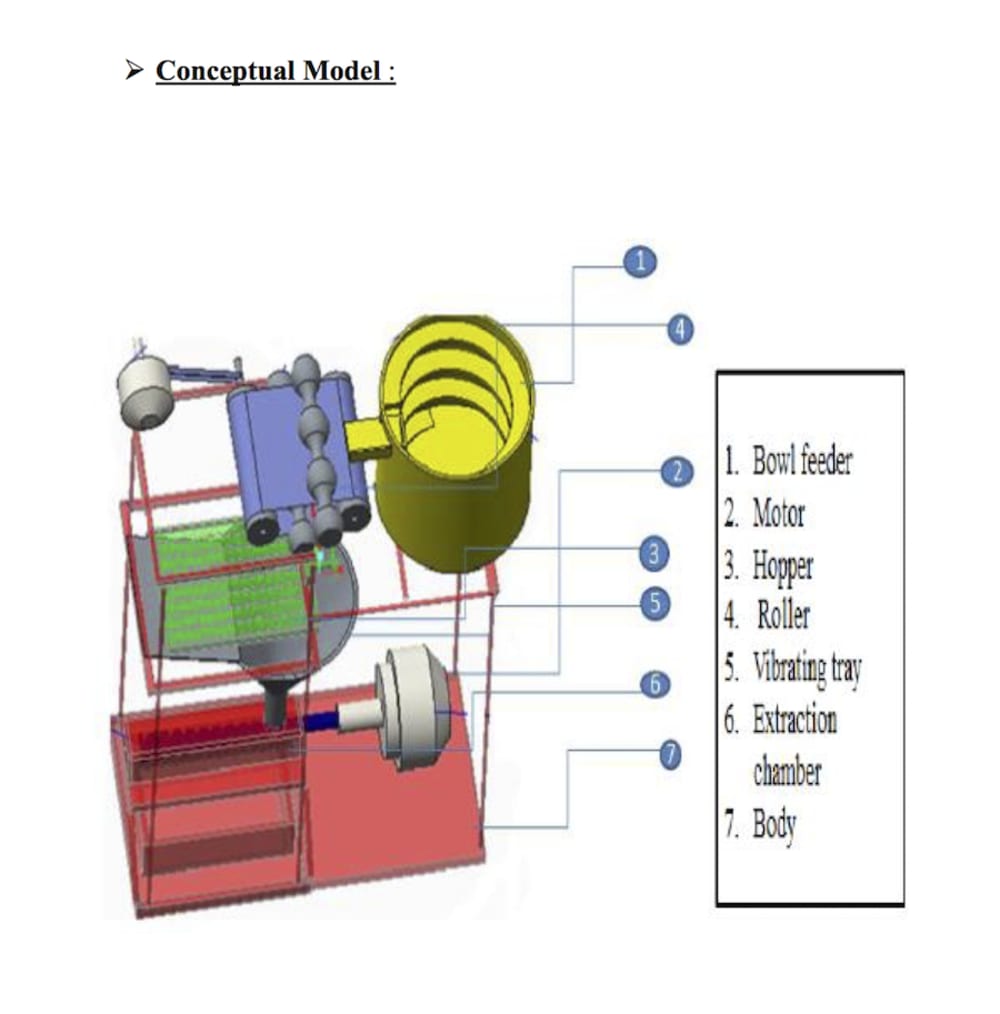 bowl feeder, crushing rollers, conveyor tray, vibrating tray, hopper and extracting chamber.