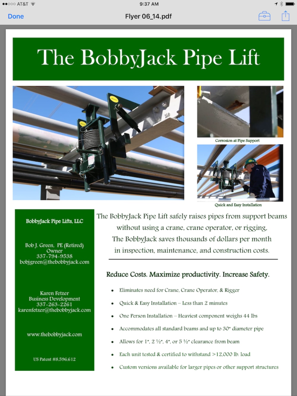 One person can install the tool and lift up to 30" diameter pipe in a matter of minutes. For a video showing The BobbyJack in use, go to www.thebobbyjack.com.