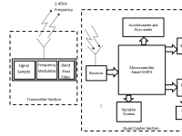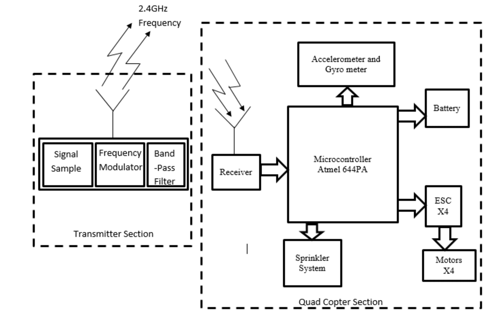 The transmitter block consists of signal sampler, frequency modulator and band pass filter. Signal sampler samples the signals at different intervals of time (multichannel operation) and frequency modulation is done and middle band frequency of 2.4GHz is selected for the band pass filter. Then the signal is transmitted in free space. The signal will be received by the Quad Copter. Frequency modulation is carried because of better reliability and performance than amplitude modulation, the frequency of the carrier is varied in accordance with the amplitude of the base band signal. In the Quad Copter section, the microcontroller, embedded with UART, ADC, PWM, BUSES constitute flight controller board. The Heart of quad copter is a microcontroller embedded with the Programs essential to control three axes moment of the quad copter i.e. Pitch, Roll and Yaw. The brushless motors are connected to the flight controller board using PWM (Pulse Width Modulated) pins, from which the speed of the motor is controlled. A UART Bridge is used to connect GPS TX, Radio TX, Video TX to the quad copter. An Analog to Digital converter is used to convert the Battery input to the board, an internal Slave Bus is used to connect Magnetometer, Gyroscope, Accelerometer. The Sprinkler System design consist of a motor with extended shaft fitted with the shower head. The motor will provide the centrifugal force required for the liquid to sprinkle in circular radius.