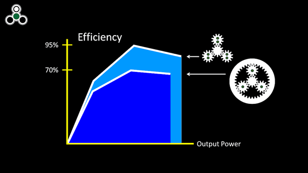 All of the parts in an Orbitless drive also exist in a Planetary drive. However, the most costly and difficult to produce part, the ring gear, is avoided. Ring gears are large, narrow, and have internal teeth. The internal teeth require special tools and processes to cut. The large size requires large machinery or must be produced in multiple sections. And the narrow body deforms when it is heat treated or manufactured from soft materials such as plastics. Consequently, ring gears are often the most expensive and inaccurate component in a Planetary drive and account for most of the energy losses.
