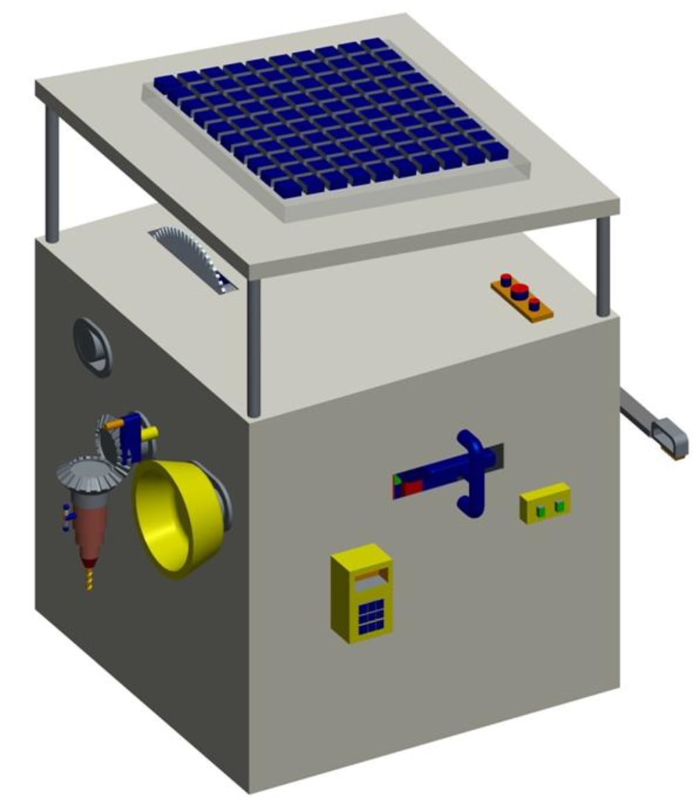 This intelligent special multiplex prospect machine also consists of a pallet jack, which makes it possible for us to move the machines to our places of requirement. The entire set up & structure of the portable hybrid powered intelligent special multiplex prospect machine comprises of an rigid metal casing, base & frames along with pulleys, shafts, bevel gears for transmitting power, scotch yoke type mechanism and chain & sprocket arrangements along with high torque electric motor. The set up & structure of the portable hybrid powered intelligent special multiplex prospect machine also houses a solar panel fitted on a tiltable platform, two high power storage capacity, rechargeable battery units, one for storing the power generated from the solar panel (which can be used in times of power loss or during low sunlight environmental conditions) & another battery unit for running the machine, switches for on/off operations, buttons & knobs for regulating the speed & for changing the directions. The portable hybrid powered intelligent special multiplex prospect machine consists of five different tools namely grinding wheel for doing grinding process, power saw blade for performing power saw machining, drill bit along with height adjustable drill bit holder & handle for carrying out drilling operation, v – shaped tool for accomplishing shaping operation, rigid cutter wheel for cutting sheets (including plates & switch boards).