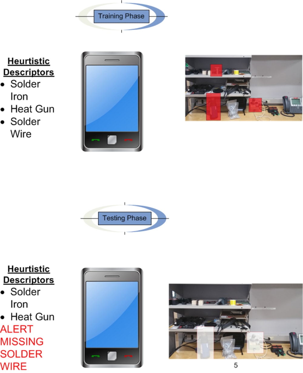 Later if objects are moved and the time has come to reorganize perhaps at the end of the day, another camera image is taken and the software application is used to identify objects again (Testing phase). If any object is missing from the selected objects of interest during the ideal case scenarios an alert is provided to the user to find the missing object and return it to the ideal location.